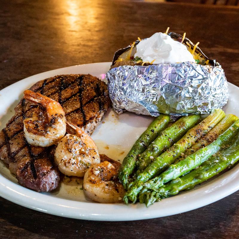 A 10 oz. ribeye steak with three bacon-wrapped shrimp stuffed with cheese and jalapeno.