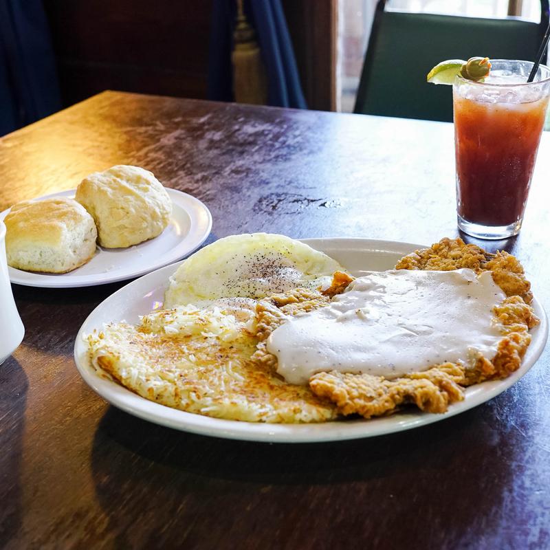 Hand-breaded chicken fried steak topped with creamy white gravy, served with two eggs.