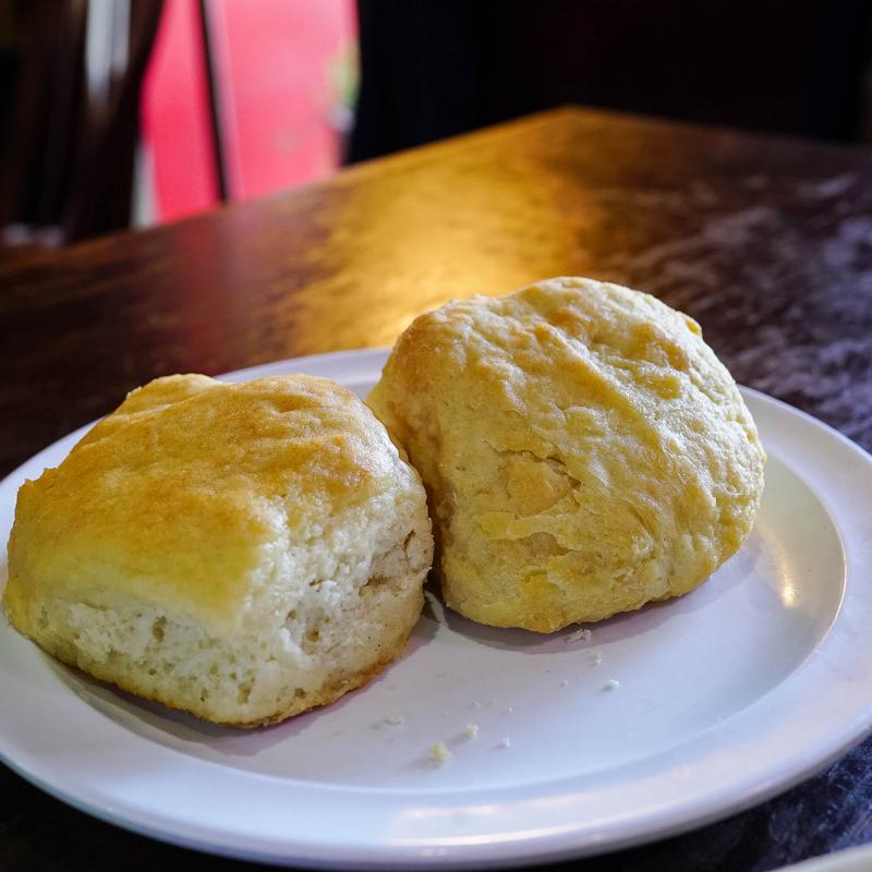 Two fluffy biscuits topped with sausage gravy and served with two eggs any style.