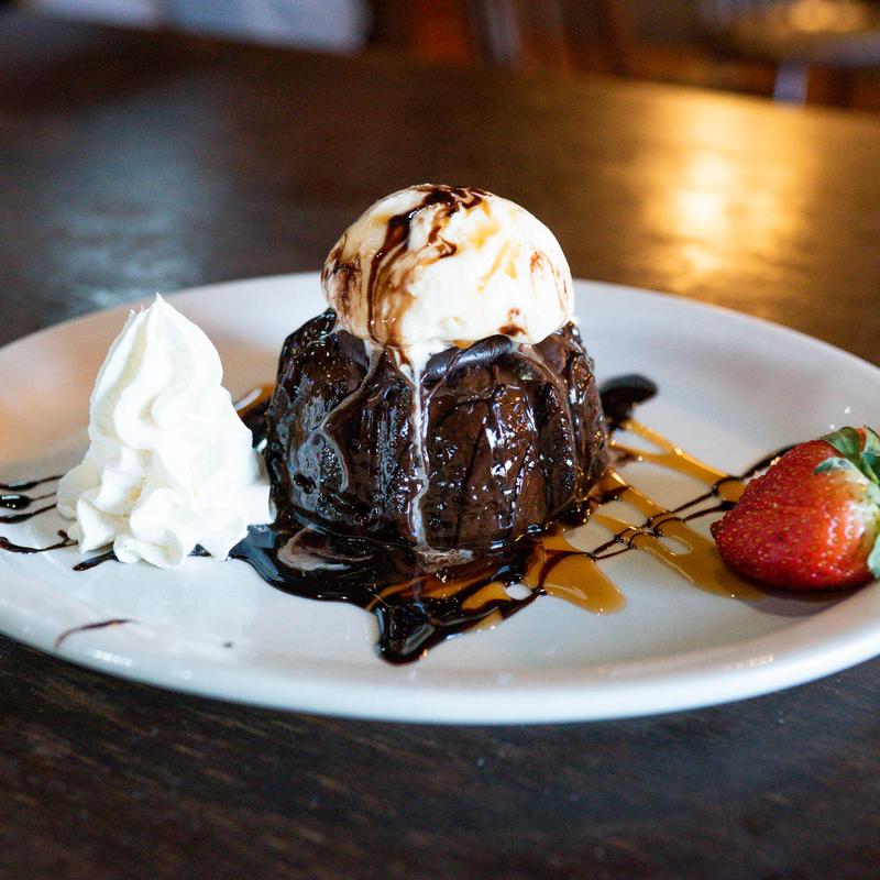 Indulgent chocolate cake with a gooey molten center, served with vanilla ice cream.